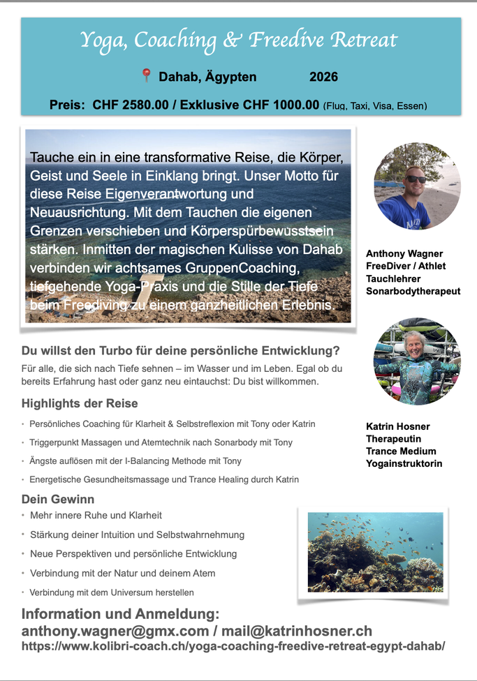 Ist das schon lange deine Vision und Wunsch, einfach wirklich-wirklich abzutauchen? In wunderschönen Apartments an der Küste des Roten Meer's mit feinem kulinarischen Essen, erwarten Dich entspannte Tage, voller Abenteuer. Mit tollen Aktivitäten von Schnorcheln, FreeDiving, Yogasessionen, Coaching, Meditationen und Körperarbeit. Wolltest du schon lange aus deiner Komfortzone ausbrechen, mit deinen Träumen synchron sein, Altes hinter dir lassen, Grenzen verschieben, und neues Leben kreieren.